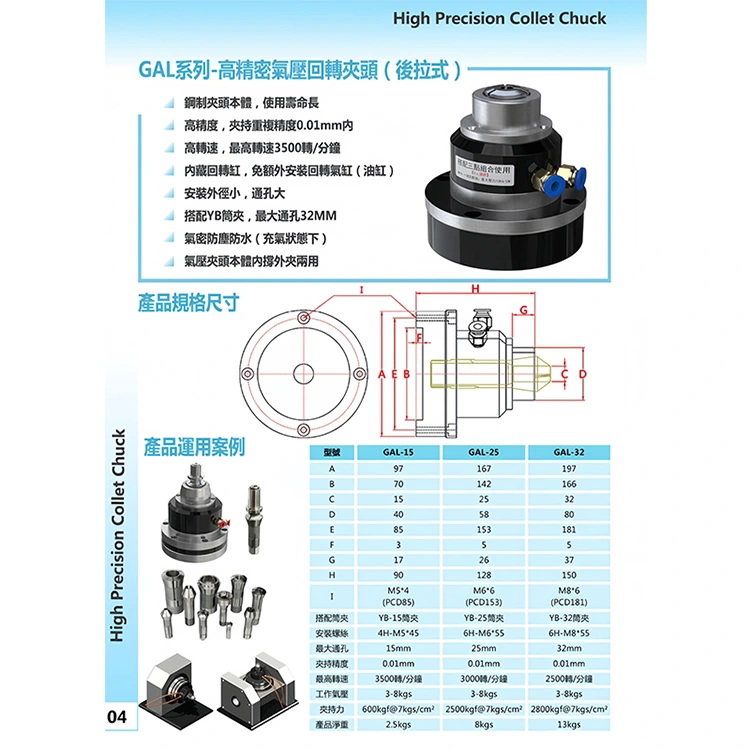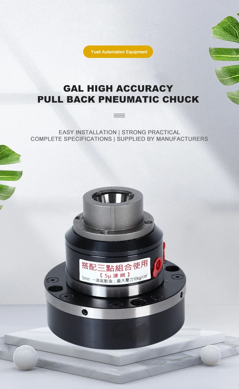 GAL-25 एक उच्च गति रोटरी वायवीय चक है। यह एक प्रकार के वायवीय चक से संबंधित है, जिसे अक्सर सीएनसी मशीनिंग, सटीक पीसने वाली मशीन और अन्य सटीक मशीनिंग उपकरण में उपयोग किया जाता है, उच्च क्लैंपिंग सटीकता के साथ, वर्कपीस के स्थिर क्लैंपिंग को प्राप्त कर सकता है, स्वचालित प्रसंस्करण प्रक्रिया में मदद करता है
